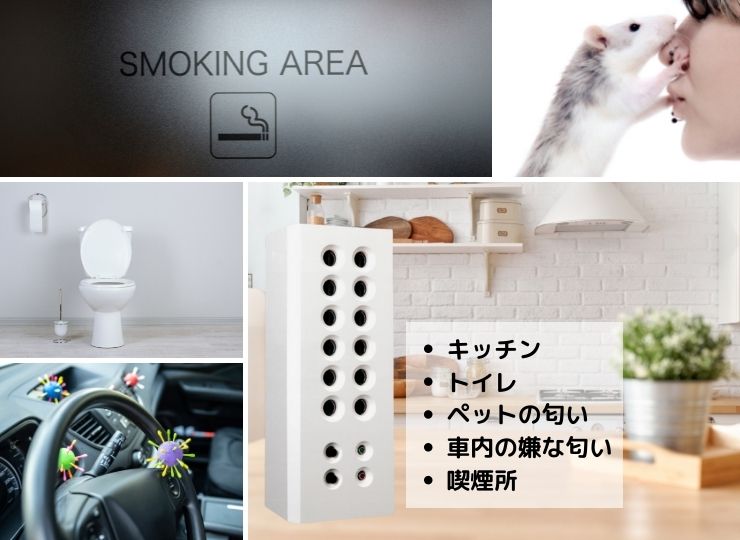 - 車内のたばこや独特のイヤな匂い消し、消煙