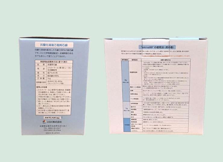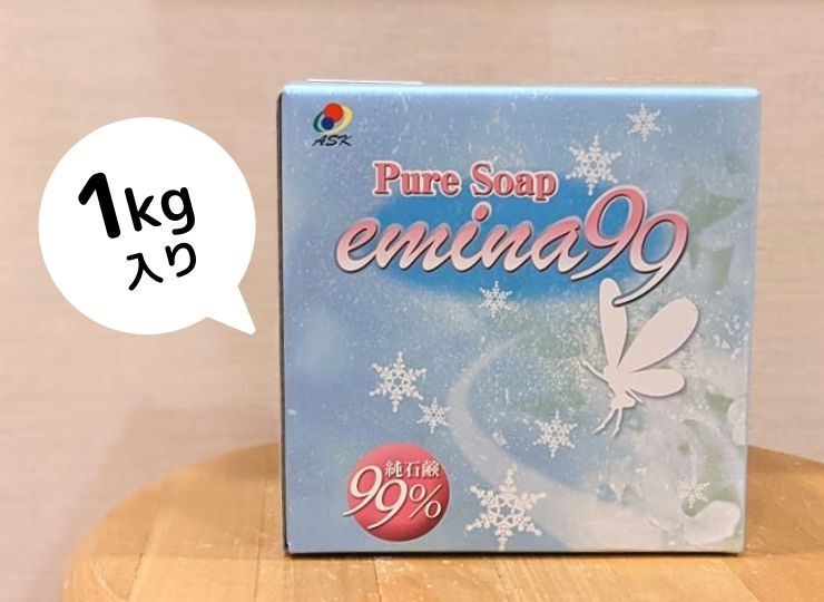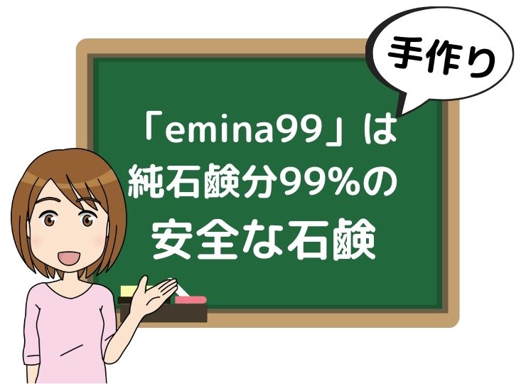 “emina99-extra-”は、純石鹸分99%を主材料とし、“真”・抗酸化溶液という特殊酵素を使って、手作りで作りあげられています。