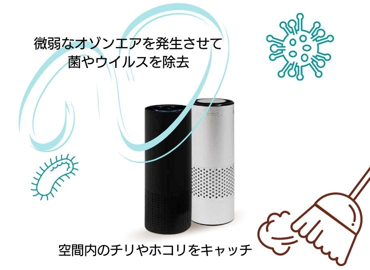 HEPAフィルターが空間内のチリやホコリをキャッチして、微弱なオゾンエアを発生させて菌やウイルスを除去します。