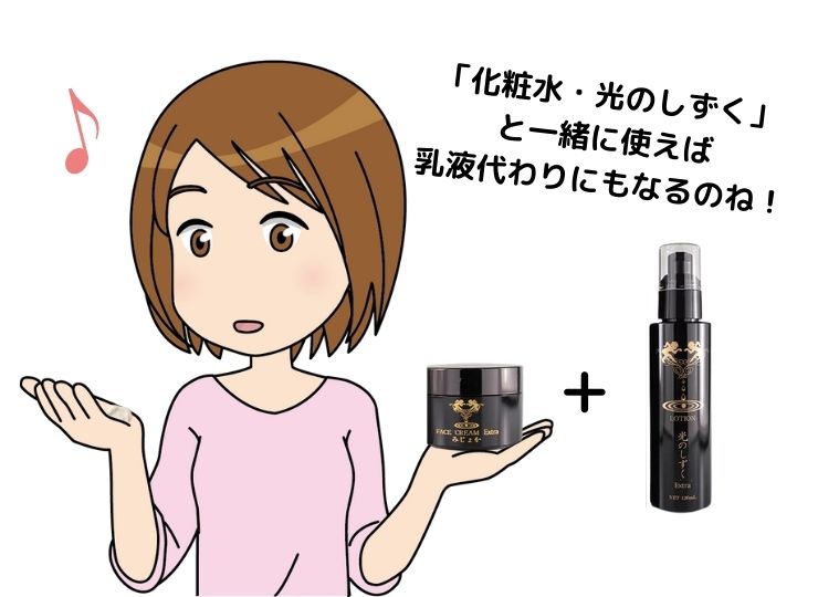- 「化粧水」光のしずくExtraと一緒に使えば乳液代わりに使えます。