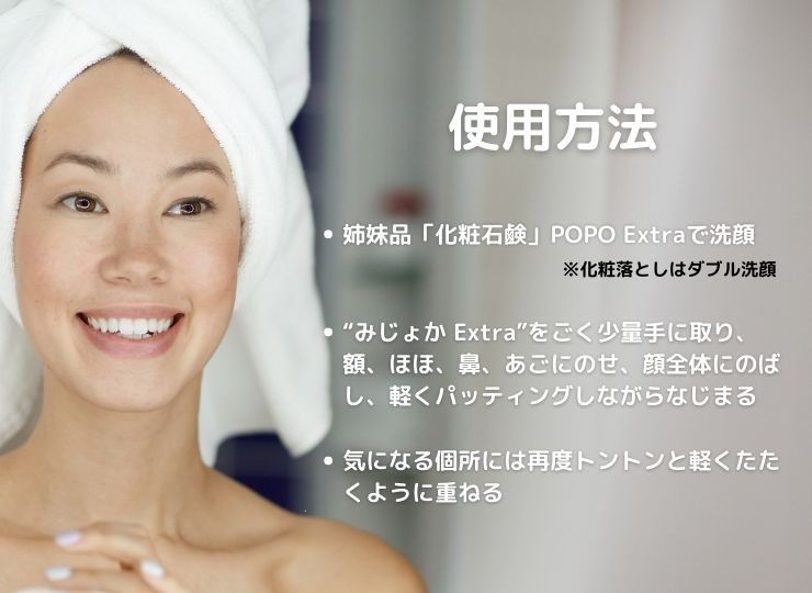 - 姉妹品「化粧石鹸」POPO Extraで洗顔します。化粧落としはダブル洗顔します。